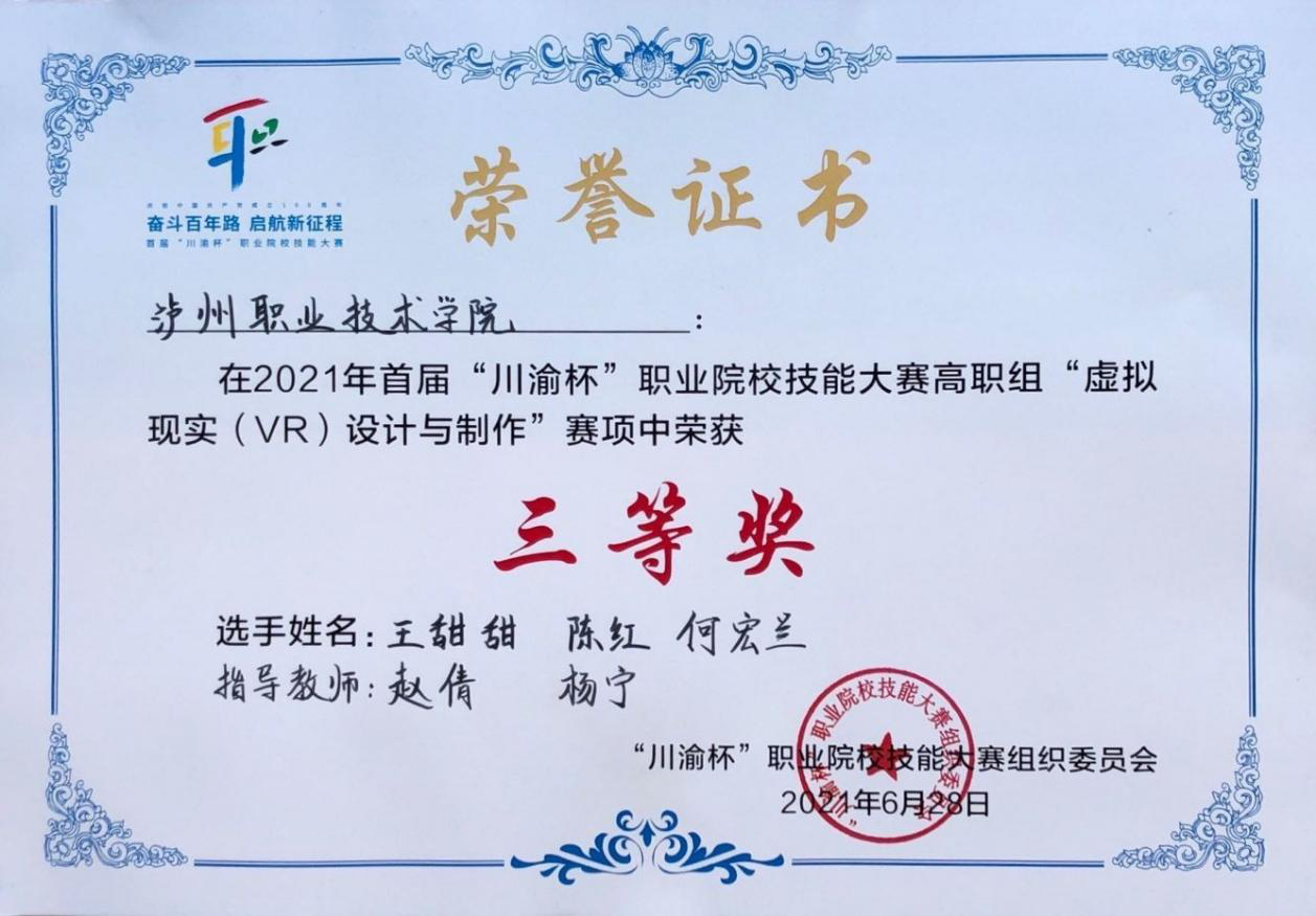 6月28日,三亿体育官网动漫专业员工参加了首届“川渝杯”虚拟现实(VR)设计与制作技能大赛。大赛由四川省教育厅、重庆市教育委员会主办,四川化工职业技术公司承办。参赛团队来自四川、重庆两地的职业院校技能大赛中获得省级奖项的公司。