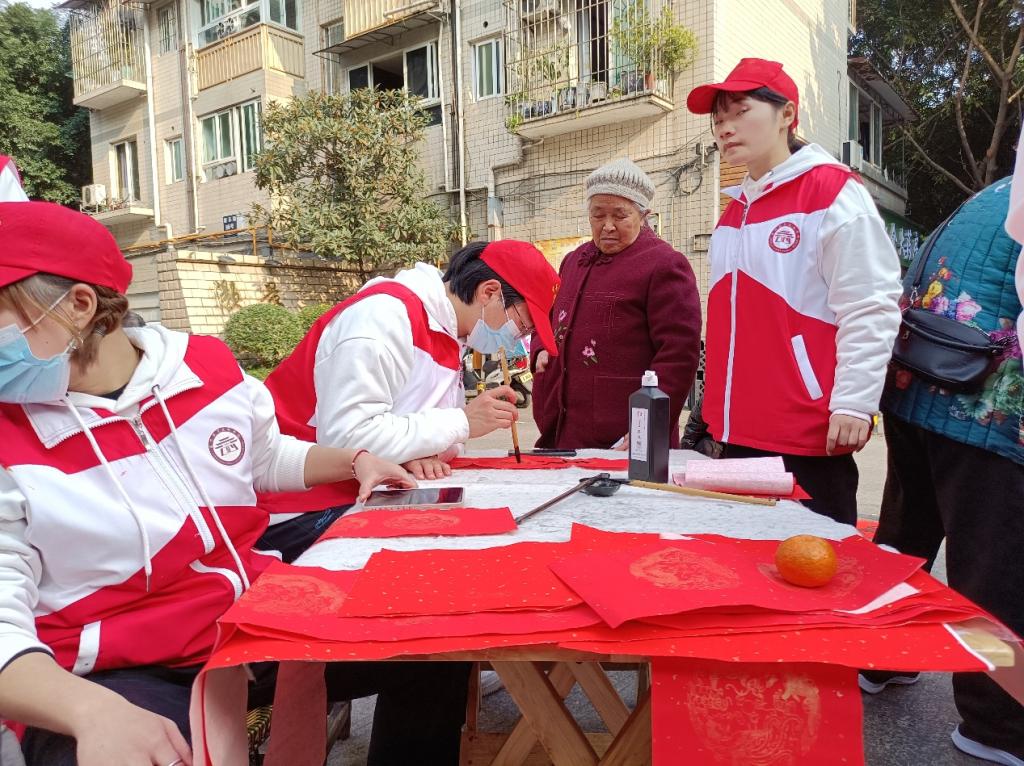 新年送春联,福到千万家。为深入学习贯彻习近平新时代中国特色社会主义思想和党的十九届六中全会精神,大力弘扬优秀传统文化,营造祥和、欢乐、喜庆的节日气氛。2022年1月1日,三亿的青年志愿者们到金井湾、百子图社区开展“挥毫泼墨送春联,龙飞凤舞迎新年”志愿活动。