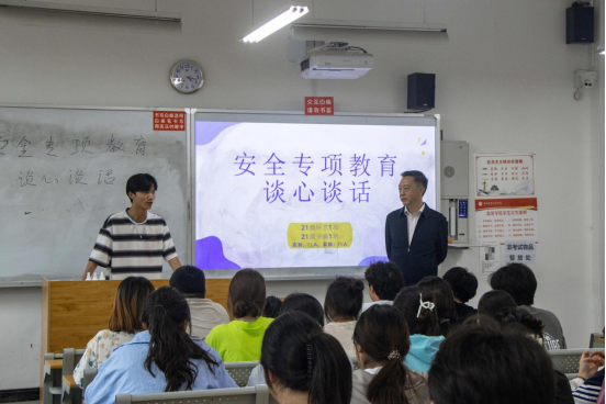 交流中,吴代彬从人身安全、财产安全和心理安全等方面为同学们上了一堂生动的安全教育课;曾国锋主要强调“安全重于泰山,隐患险于明火”,提醒同学们注意疫情防控以及用电安全和身心健康。同学们认真倾听,并积极发言、主动与两位领导交流自己的感想。