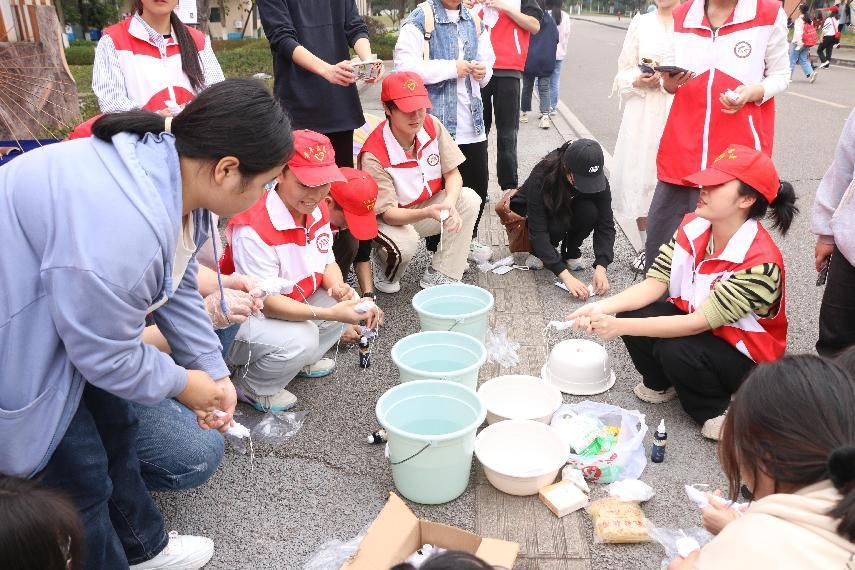 在活动开展前,志愿者提前将所需要展示的物品进行摆放,为同学们提供并营造了良好的活动环境与氛围。活动中,志愿者秉承雷锋精神积极宣传非遗传统手工作品,同时让同学们亲身体验了扎染制作流程,并且还吸引了外国友人的驻足,充分展现了非遗文化的魅力,让非遗文化与我们零距离。