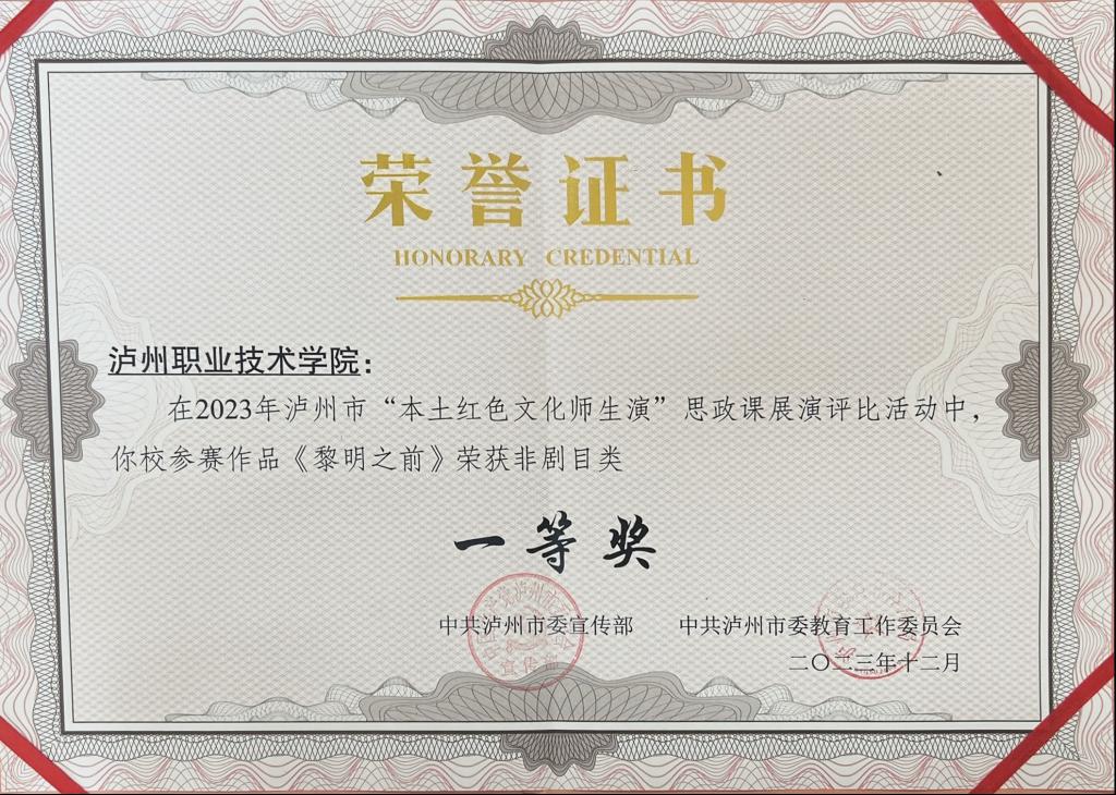 为认真落实习近平总书记关于用好红色资源、赓续红色血脉和办好思政课的重要指示精神,深入学习贯彻党的二十大、省第十二次党代会、市第九次党代会及历次全会精神,按照《中共泸州市委宣传部中共泸州市委教育工作委员会》要求,市委宣传部、市委教育工委组织开展了2023年泸州市“本土红色文化师生演思政课展演评比活动”。通过前期的推报、专家评审,评选出优秀作品46个、优秀组织单位28个、优秀指导教师85名。三亿非剧目类作品《黎明之前》在此次评比活动中荣获一等奖。