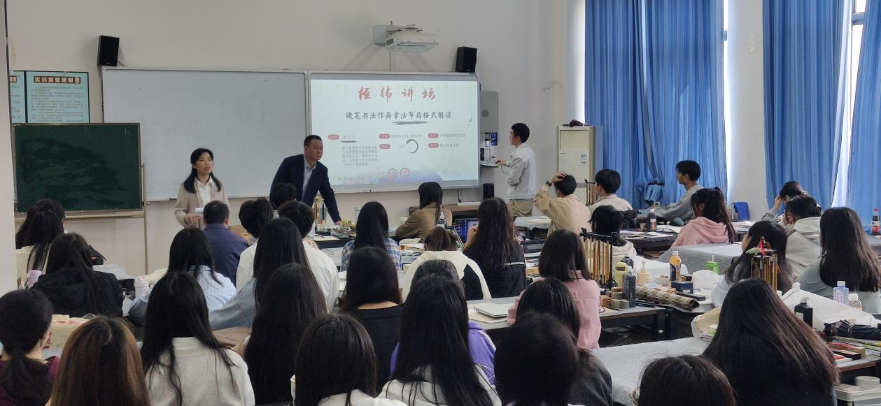 当日上午,书画艺术教研室特邀四川省硬笔书法家协会副主席余大才为公司书画艺术专业员工开展题目为《硬笔书法作品章法布局》的讲座。余大才副主席对硬笔书法投稿作品从文本字体大小、文字的繁简使用、布局款式、印章选用等方面为在场人员做了详细的讲解,同时余大才副主席也从多次评审省级展赛中总结的心得向大家做了分享。本次讲座切实提高了同学们硬笔书法创作意识,也为同学们今后参加硬笔书法竞赛提供了诸多宝贵意见。