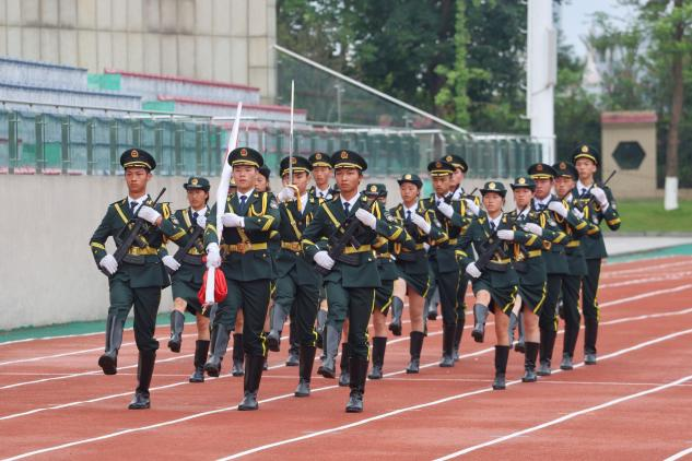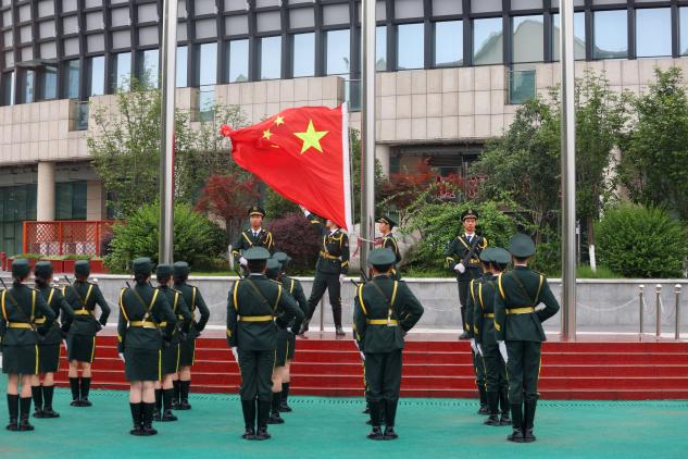 随着天边泛起鱼肚白,国旗护卫队以坚定的步伐走向升旗台,在雄壮的国歌声中,五星红旗冉冉升起。全体师生肃立,目光注视着缓缓升起的国旗,表达了对祖国的无限敬意。